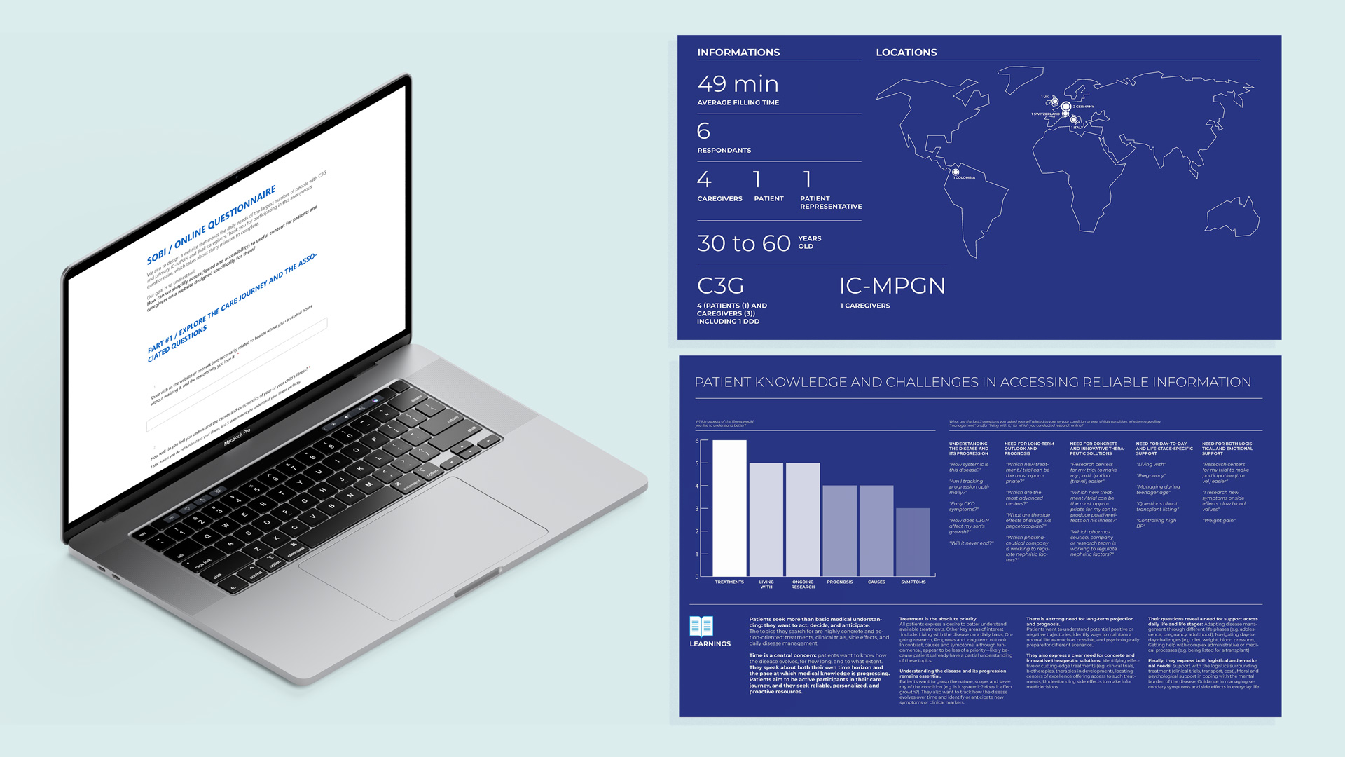 I designed a detailed online questionnaire and structured a patient feedback process to explore their care journeys, their content gaps and pain points, the emotional experience, the care journey friction points, their digital service and formats expectations (search, saving content, tools) and their tone and format preferences.