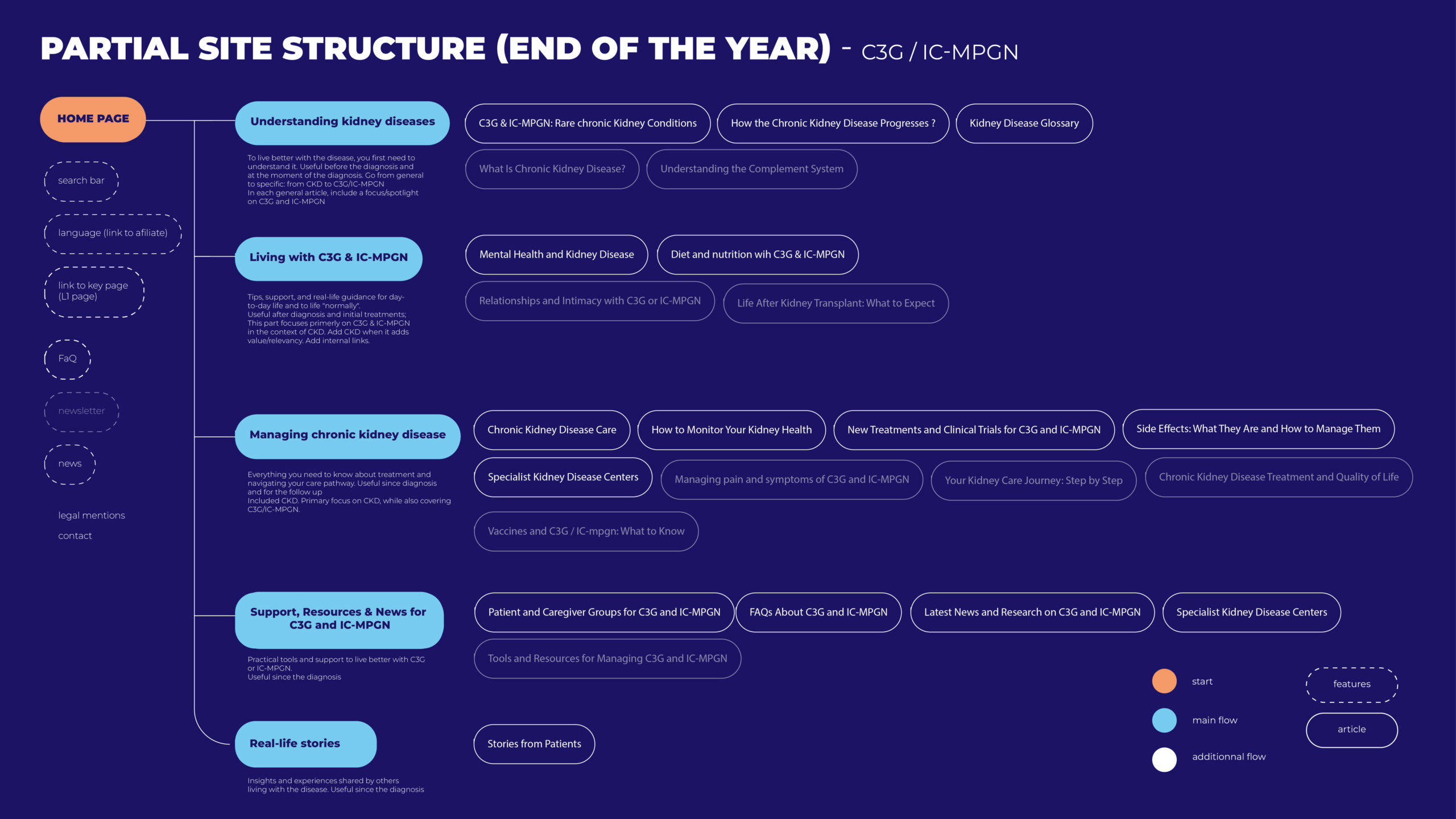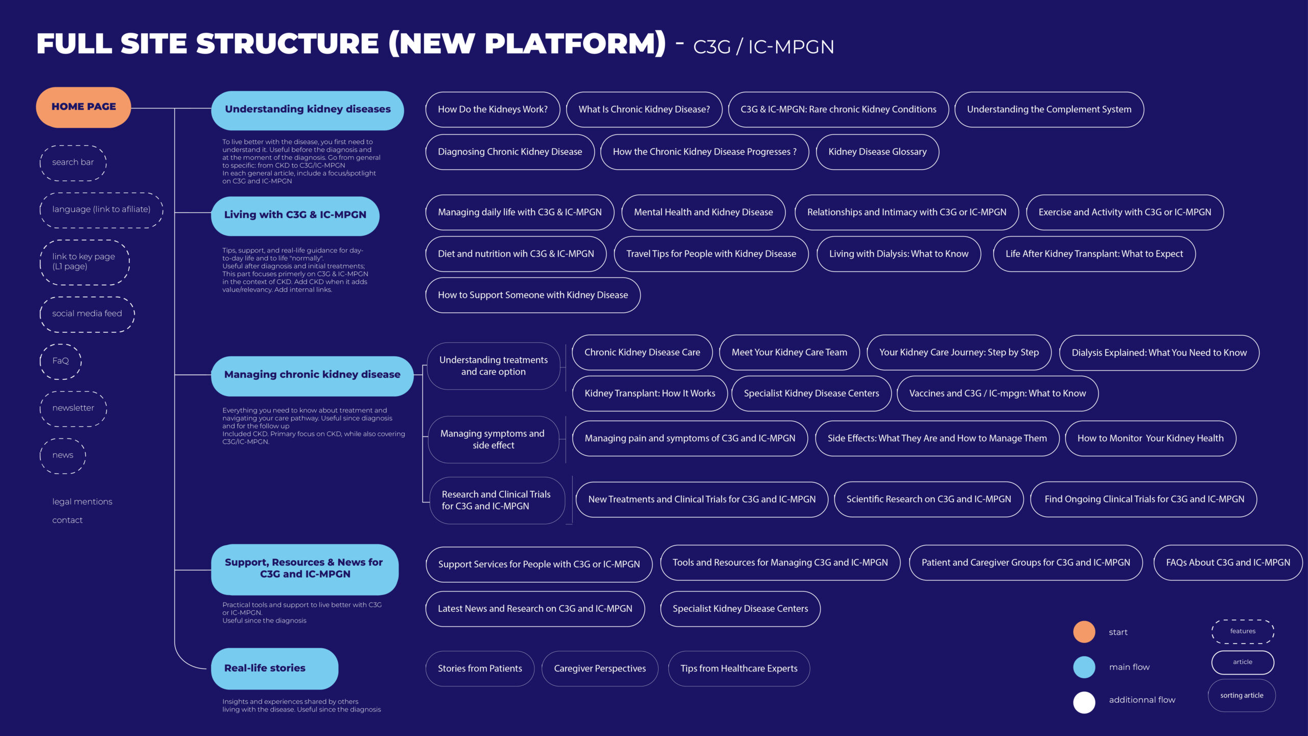 The first pillar, Understanding Kidney Disease, was designed as a funnel-based educational pathway. This section provides essential foundational knowledge for patients and caregivers, particularly at or around the time of diagnosis. The strategic principle was simple: to live better with a disease, you must first understand it. The content moves intentionally from general to specific, from CKD to C3G/IC-MPGN, supporting patients before diagnosis, at diagnosis, and during early understanding.
